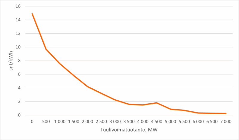 Kuvasta 2 voidaan huomata, että jo 3 500 MW tuulivoimatuotanto on keskimäärin riittänyt laskemaan sähkön hinnan alle 2 snt/kWh. Sähkön hinta voi kuitenkin ajoittain nousta korkeaksi, vaikka tuulivoimatuotantoa olisi reilusti tarjolla. Tällainen tilanne voi syntyä esimerkiksi, jos iso ydinvoimalayksikkö poistuu tuottamasta peruskuormaa sähköverkkoon. Lisääntynyt tuulivoimatuotanto ja sen kasvanut osuus sähkön kokonaistuotannosta selittää sähkön hinnan suuria vaihteluita, sillä sen myötä sähköstä voi olla ajoittain ylitarjontaa ja toisaalta niukkuutta.