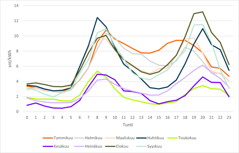 Kuvasta 3 voidaan havaita, että sähkön hinnassa on kaksi selvää piikkiä vuorokauden aikana. Ensimmäinen piikki havaitaan aamulla kello 7–10 välillä ja toinen illalla kello 18–22. Tämä on seurausta sähkön kulutuksen kasvusta kyseisinä ajanhetkinä. Esimerkiksi aamulla ihmiset heräävät suunnilleen samaan aikaan ja alkavat kuluttamaan sähköä enemmän yhtä aikaa. Juuri näille hetkille on tärkeää saada ajoitettua joustoa esimerkiksi sähköakkujen avulla. Tämä on kuluttajan kannalta taloudellisesti kannattavaa, mutta tarjoaa myös vakautta sähköverkolle. Kuvasta havaitaan myös, että sähkö on yleisesti kylminä kuukausina kalliimpaa ja hintapiikit ovat korkeampia kuin lämpiminä kuukausina. Tämä on seurausta siitä, että sähköä kulutetaan talvella enemmän, joten käytössä on kalliimpia tuotantomuotoja.