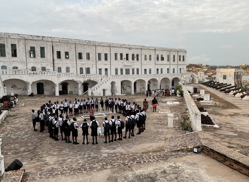 Tämän lisäksi Afrikassa on monimutkainen suhde orjuuteen. Yli 10 miljoonan ihmisen epäinhimillinen kohtelu (Lewis, 2025), jota valloittajat johtivat, ei olisi voinut tapahtua ilman, että afrikkalaiset olivat itse mukana sitä mahdollistamassa (Think Africa, 2021). Tuon aikakauden jäljet näkyvät yhä, mikä kävi ilmi kun AgrBIZZ hankkeen työpaja pidettiin Ghanassa Cape Coastin yliopistossa (UCC, n.d.). Siirtomaavallan aikana Kultarannikoksi kutsutun Ghanan rantaviivaa täplittää noin 50 linnoista (Osei-Tutu, 2004), joihin orjia koottiin ja joista heidän lähettiin suunnattoman vaaralliselle merimatkalle. Kun kävimme työpajavierailun aikana yhdessä näistä linnoituksista, siellä näkyi koululaisryhmä tutustumassa paikan historiaan. Aina näin ei ole ollut, vaan sukupolvia on kasvatettu linnoituksen vieressä ilman, että siellä olisi käyty.