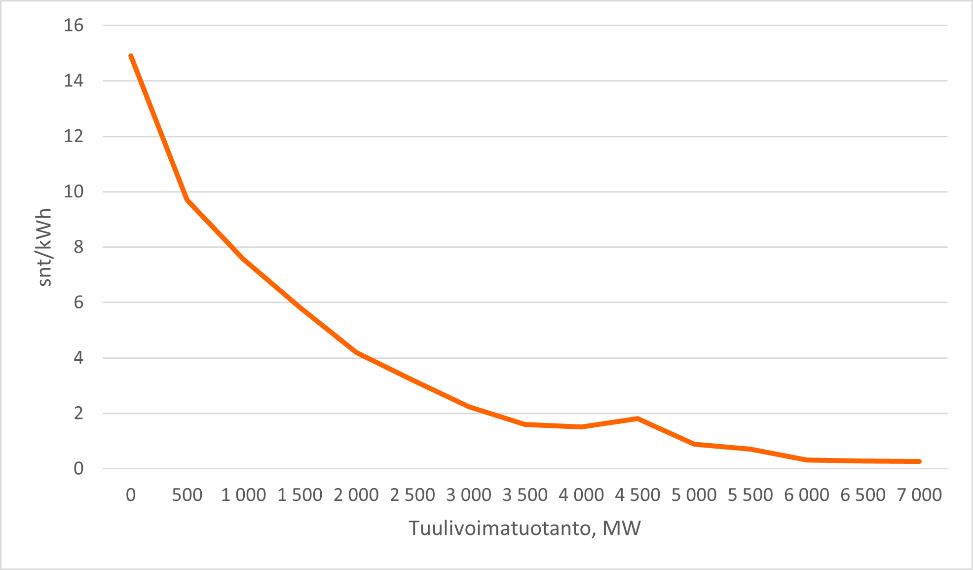 Kuvasta 2 voidaan huomata, että jo 3 500 MW tuulivoimatuotanto on keskimäärin riittänyt laskemaan sähkön hinnan alle 2 snt/kWh. Sähkön hinta voi kuitenkin ajoittain nousta korkeaksi, vaikka tuulivoimatuotantoa olisi reilusti tarjolla. Tällainen tilanne voi syntyä esimerkiksi, jos iso ydinvoimalayksikkö poistuu tuottamasta peruskuormaa sähköverkkoon. Lisääntynyt tuulivoimatuotanto ja sen kasvanut osuus sähkön kokonaistuotannosta selittää sähkön hinnan suuria vaihteluita, sillä sen myötä sähköstä voi olla ajoittain ylitarjontaa ja toisaalta niukkuutta.