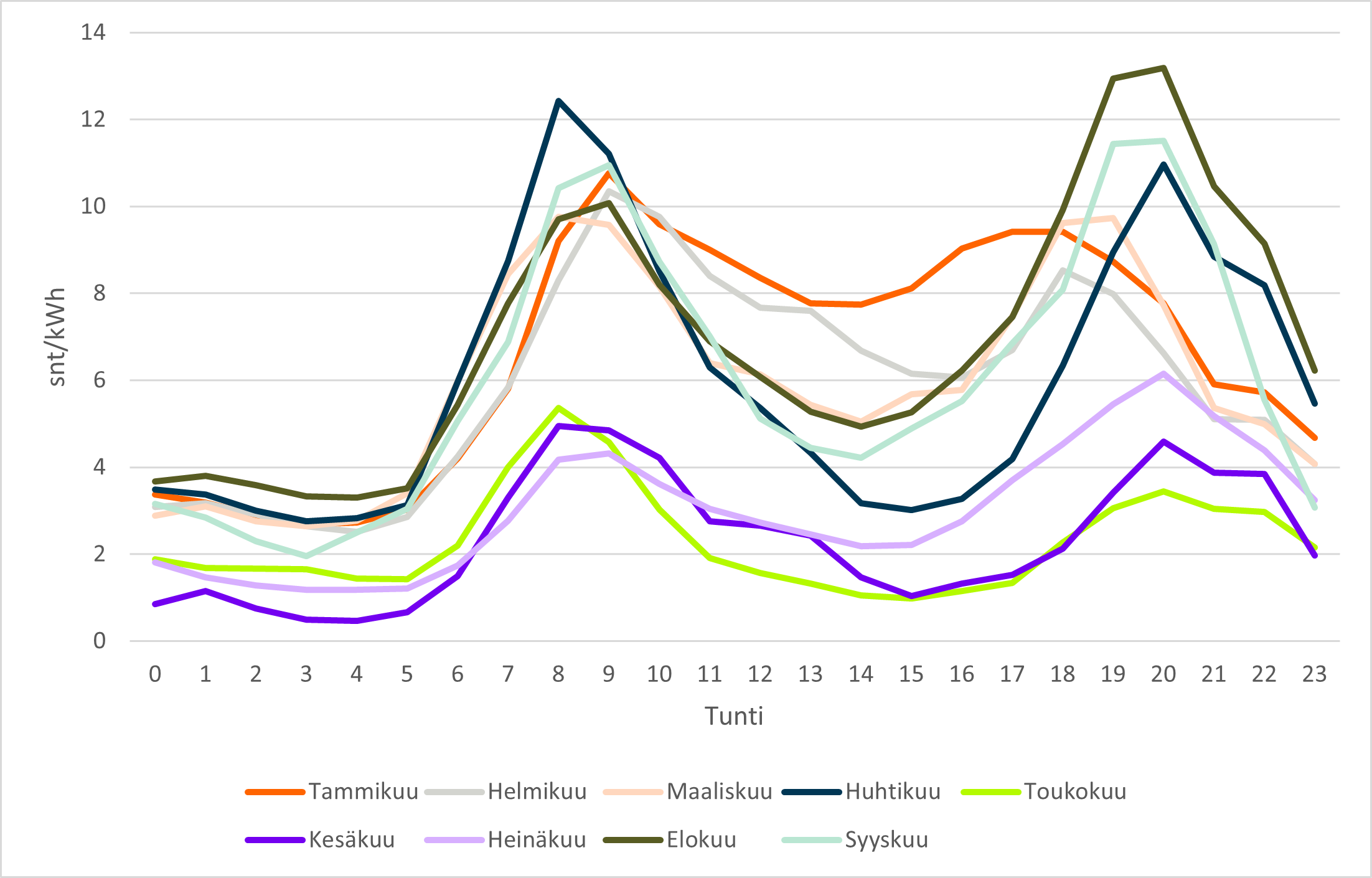 Kuvasta 3 voidaan havaita, että sähkön hinnassa on kaksi selvää piikkiä vuorokauden aikana. Ensimmäinen piikki havaitaan aamulla kello 7–10 välillä ja toinen illalla kello 18–22. Tämä on seurausta sähkön kulutuksen kasvusta kyseisinä ajanhetkinä. Esimerkiksi aamulla ihmiset heräävät suunnilleen samaan aikaan ja alkavat kuluttamaan sähköä enemmän yhtä aikaa. Juuri näille hetkille on tärkeää saada ajoitettua joustoa esimerkiksi sähköakkujen avulla. Tämä on kuluttajan kannalta taloudellisesti kannattavaa, mutta tarjoaa myös vakautta sähköverkolle. Kuvasta havaitaan myös, että sähkö on yleisesti kylminä kuukausina kalliimpaa ja hintapiikit ovat korkeampia kuin lämpiminä kuukausina. Tämä on seurausta siitä, että sähköä kulutetaan talvella enemmän, joten käytössä on kalliimpia tuotantomuotoja.