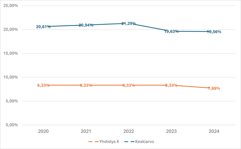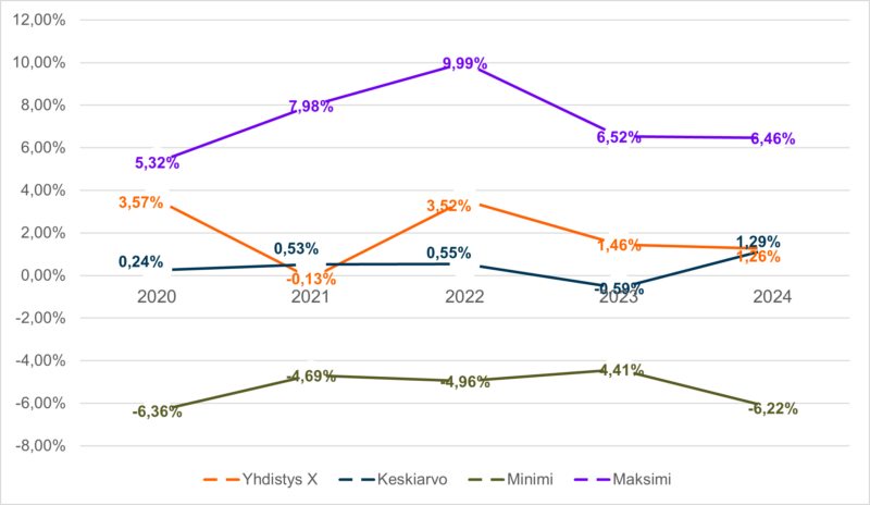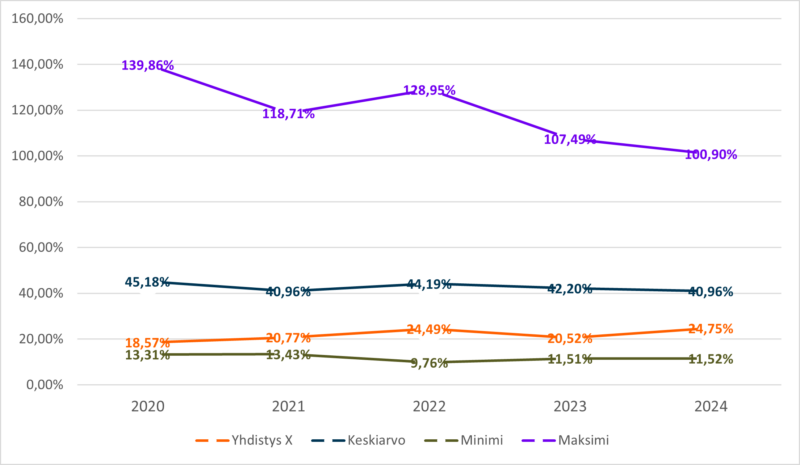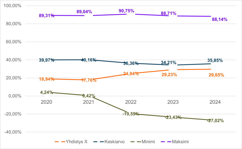 Kuviossa 1 on esitelty aineiston sekä yhden setlementin eli yhdistys X:n liiketulosprosentit vuosina 2020–2024. Aineiston keskiarvojen lisäksi kuviossa on mukana aineiston maksimi- ja minimiarvot antamassa kuvaa aineiston yhdistysten välisestä vaihtelusta. Aineiston keskiarvo koko ajanjaksolla on 0,40 %, eli juuri ja juuri positiivisen puolella. Sinällään tämä on kohtalaisen hyvä tulos, mutta se tarkoittaa myös, että osalla aineiston yhdistyksistä menee hyvin ja osalla heikosti. Kaikilla tarkastelluilla yhdistyksillä oli sekä voitollisia että tappiollisia vuosia, mutta osalla tappiollisia oli enemmän. Tämän artikkelin kuvioissa esimerkkinä käytetty yhdistys X on aineiston kolmanneksi pienin yhdistys. Sillä ei ole opistotoimintaa, mutta se harjoittaa elinkeinotoimintaa yhdistyksen alla. Liiketulosprosenttien osalta kuviosta 1 nähdään, että yhdistys X on vuosina 2020–2024 pärjännyt hieman aineiston keskiarvoa paremmin.