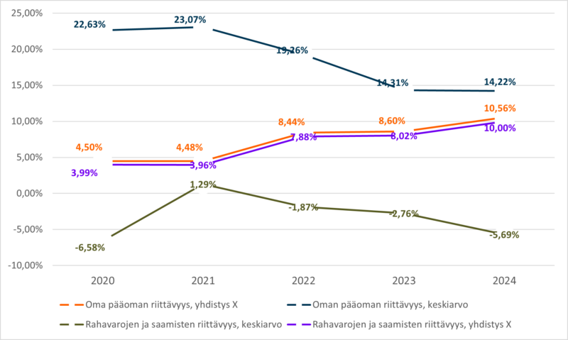 Kuviossa 6 on kuvattu sekä oman pääoman riittävyyden tunnusluvut vuosina 2020–2024 että rahavarojen ja saamisten riittävyys. Näin voidaan tarkastella näitä kahta tunnuslukua rinnakkain. Kuvio näyttää myös hyvin, miten näiden kahden tunnusluvun arvot eroavat toisistaan silloin, kun oma pääoma on pitkälti kiinni omaisuudessa. Aineiston yhdistyksistä vain kahdella nämä kaksi tunnuslukua antoivat hyvin samanlaiset arvot, mikä kertoo siitä, että kyseisten yhdistysten oma pääoma on suurelta osin likvidejä rahavaroja pankkitilillä. Toinen näistä on tämän artikkelin esimerkkinä käytetty yhdistys X. Aineiston kaikilla muilla kahdeksalla yhdistyksellä oma pääoma oli kiinni suurelta osin kiinteistöissä ja osakkeissa. Aineiston keskiarvot olivat oman pääoman riittävyyden osalta hyvällä tasolla vielä vuosikymmenen alussa, mutta aineistossa oma pääoma keskimäärin on laskenut, joten myös sen riittävyys on laskenut vain tyydyttävälle tasolle. Rahavarojen ja saamisten riittävyyden osalta aineiston keskiarvo puolestaan on negatiivinen, mikä tarkoittaa, että keskimäärin aineiston yhdistyksissä on lyhytaikaisia velkoja enemmän kuin rahavaroja ja saamisia. Yhdistys X:n oman pääoman riittävyys on seurantajaksolla noussut heikolta tasolta tyydyttävälle tasolle ja rahavarojen ja saamisten riittävyys puolestaan heikolta tasolta hyvälle tasolle. Näiden lukujen parannus on linjassa omavaraisuuden kasvun kanssa.