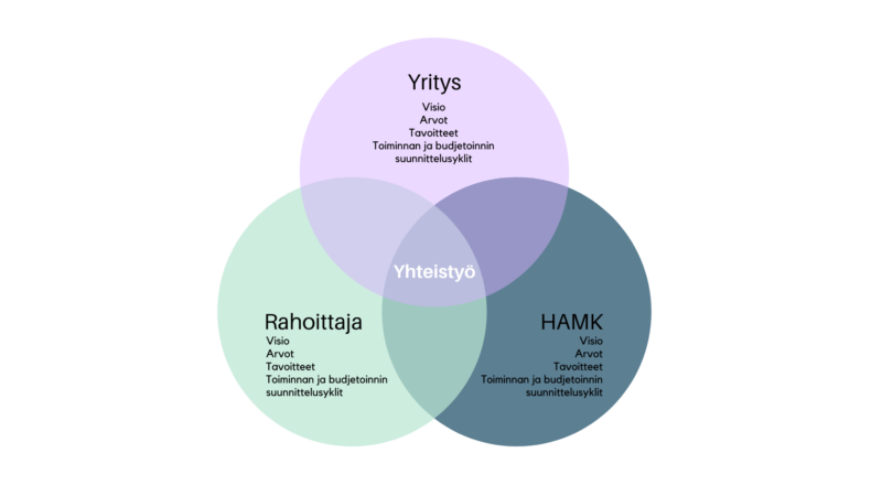 Ammattikorkeakoulujen yritysyhteistyö rakentuu kolmen osapuolen yhteenliittymässä (kuvio 1). Yritysyhteistyön kehittämisen keskiössä ovat sekä ammattikorkeakoulun omat että yhteistä toimintaa rahoittavien tahojen visiot, arvot, tavoitteet sekä toiminnan ja budjetoinnin suunnittelusyklit. Jotta yhteistyö mahdollistuu, näiden tulee kohdata yritysten visioiden, arvojen, tavoitteiden sekä toiminnan ja budjetoinnin suunnittelusyklien kanssa.