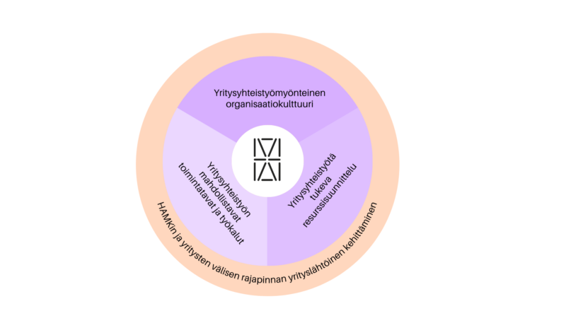 Yritysyhteistyömyönteinen organisaatiokulttuuri, yritysyhteistyön mahdollistavat toimintatavat ja työkalut, sekä yritysyhteistyötä tukeva resurssisuunnittelu nousivat yhteiskehittämistilaisuudessa tekijöiksi, joista muodostuu HAMKin sisäisen yritysyhteistyön kehittämistyön kolme peruspilaria, kuten kuvio 2 havainnollistaa. Nämä organisaation sisäiset yritysyhteistyön kantavat voimat ovat edellytys sille, että organisaation sisäisestä maailmasta voidaan liikkua ulospäin, kohti ammattikorkeakoulujen ja yritysten välisen rajapinnan yrityslähtöistä kehittämistä. Rajapinnan ulkopuolelle jää yritysten oma korkeakouluyhteistyön kehittämistyö.
