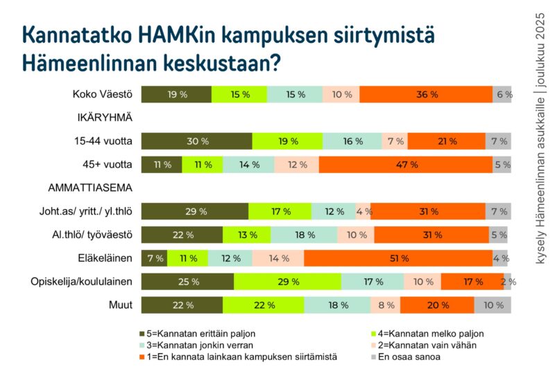 ”Vastaajaryhmien erot tässä kyselyssä ovat poikkeuksellisen suuria. On tavallaan ymmärrettävää, että jos kaupungin ja korkeakoulun tulevien vuosikymmenten kehitys ei kosketa suoraan itseä tai omia lapsia, sitä ei koeta niin tärkeäksi. Puhumme kuitenkin investoinnista tuleviin vuosikymmeniin. Tarkoitus on vahvistaa alueen korkeakoulutuksen tulevaisuutta. Keskustakampus rakentuisi 2030-luvun alkupuolella ja sen tähtäin on pitkällä 2040-luvulla”, sanoo HAMKin kehitysjohtaja Mari Kamaja.