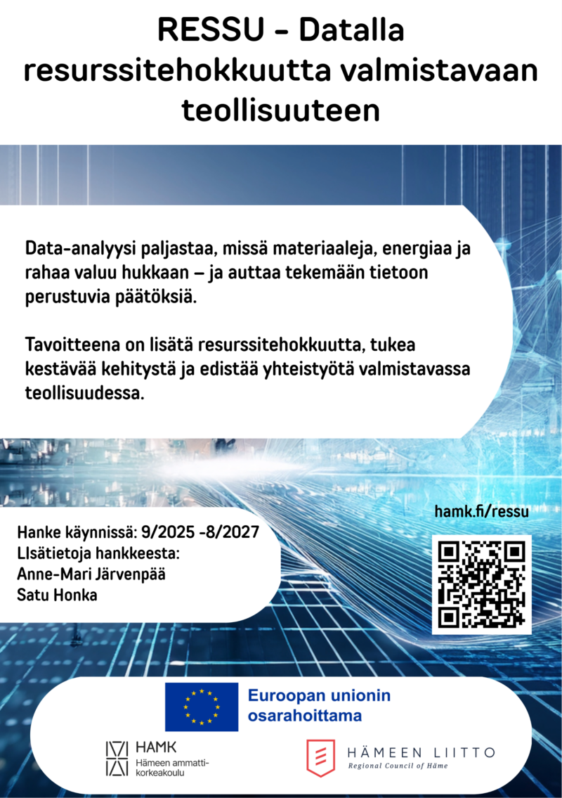 Animoitu grafiikka, jossa näkyy kaupunkikuva teollisuusrakennuksine ja vesistöineen, sekä teksti "RESSU - Datalla resurssitehokkuutta valmistavaan teollisuuteen", Hämeen ammattikorkeakoulun, Euroopan unionin yhteisrahoituksen ja Hämeen Liiton logot.